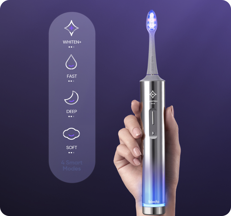 Bixdo 採用院線級冷光藍光技術,搭配專屬活性氧美白牙膏,美白力達一般口腔護理的 2.7 倍;刷頭配備 Perlon 光導纖維,可提升 4 倍光能量傳導,強化藍光美白效能。經第三方機構測試驗證,日常刷牙同步啟動美白功能,14 日內牙齒最高可提亮 21 度,唔使額外儀器或護理步驟,高效慳時。